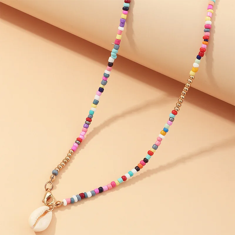 Boho Multicolor Beaded Choker Beaded Stackable Necklace with Shell Pendant Boho Summer Beach Necklace for Women